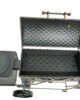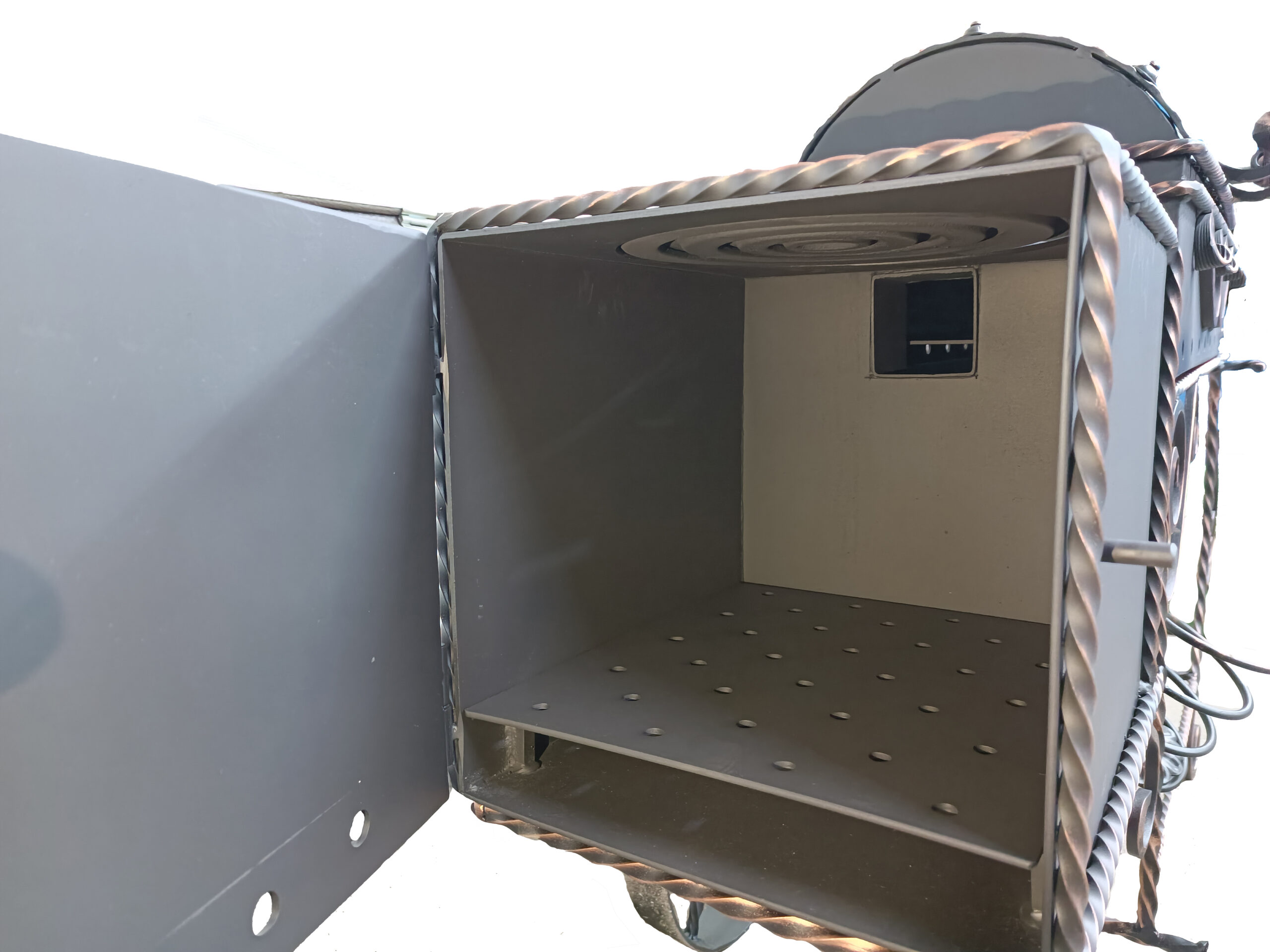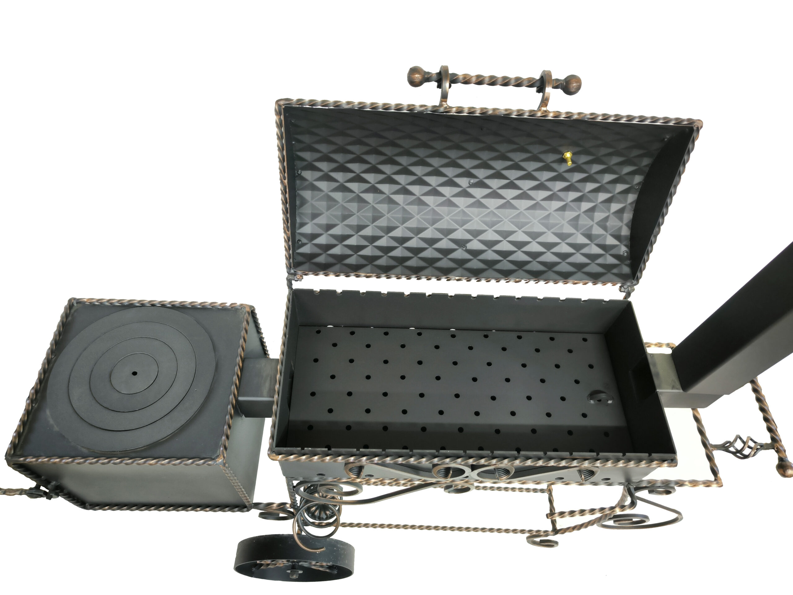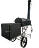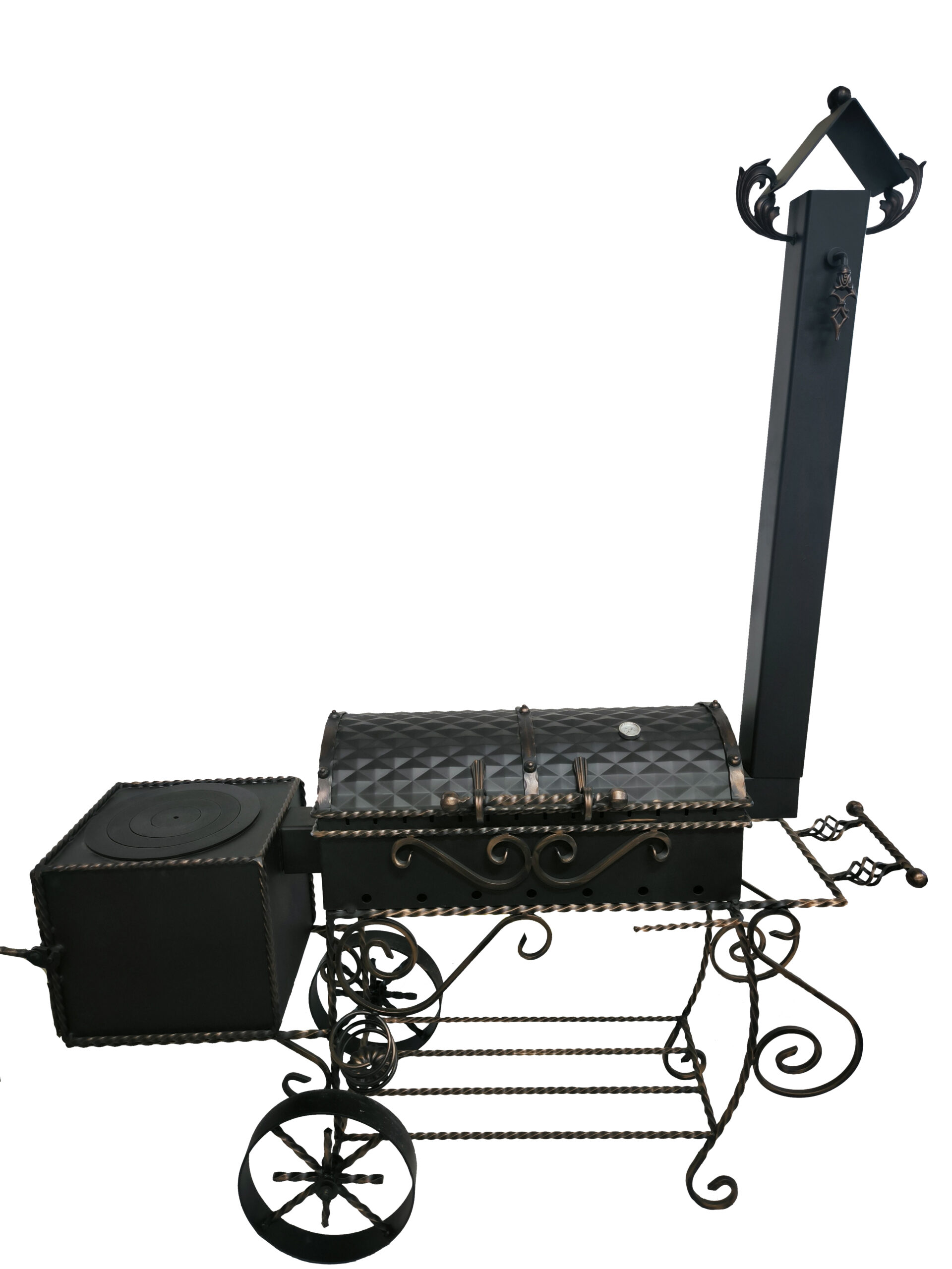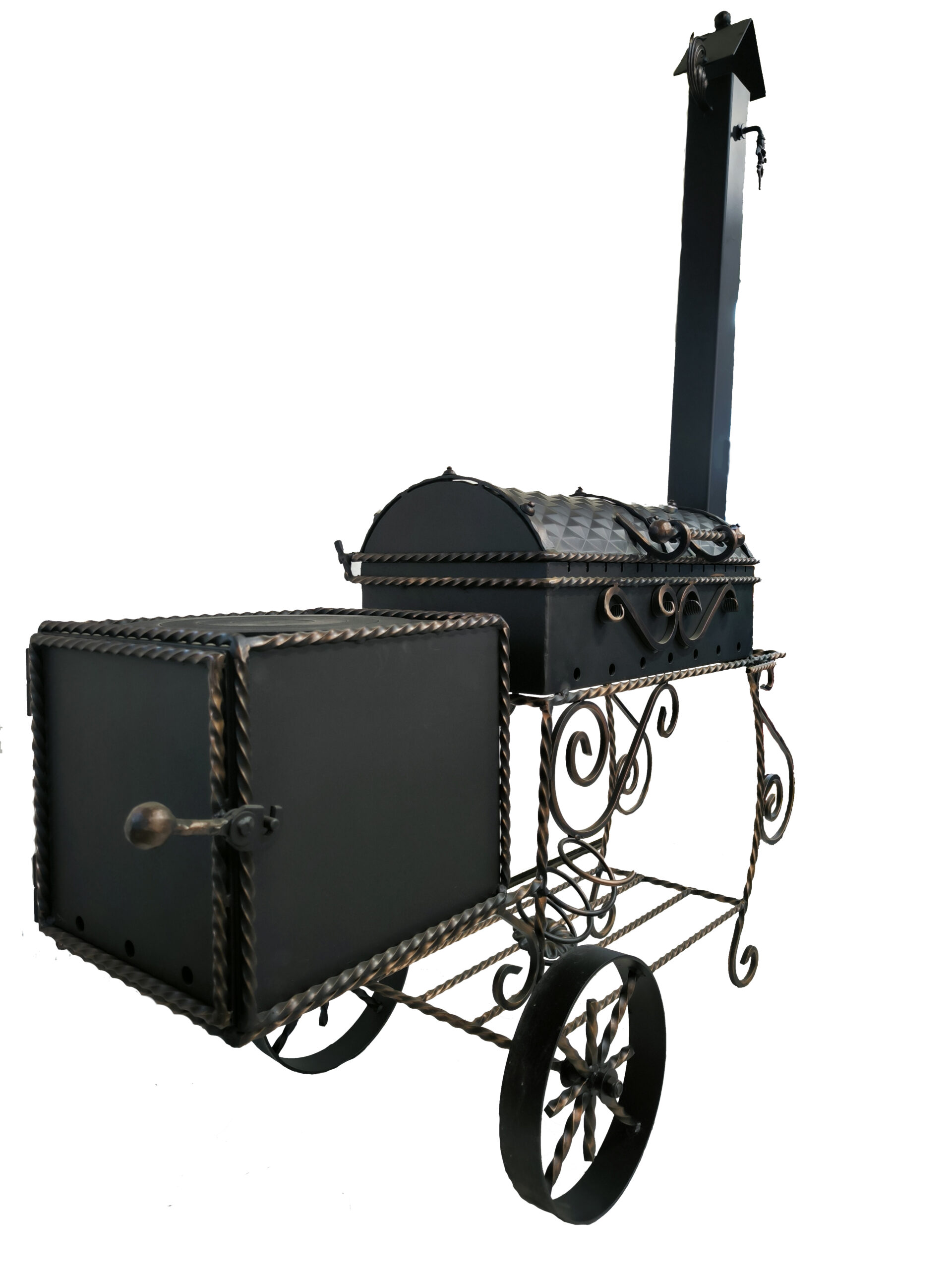 Šašlykinė su rūkykla mobili – su ratais, apačioje metalinių strypų lentyna skirta sudėti malkoms.