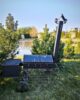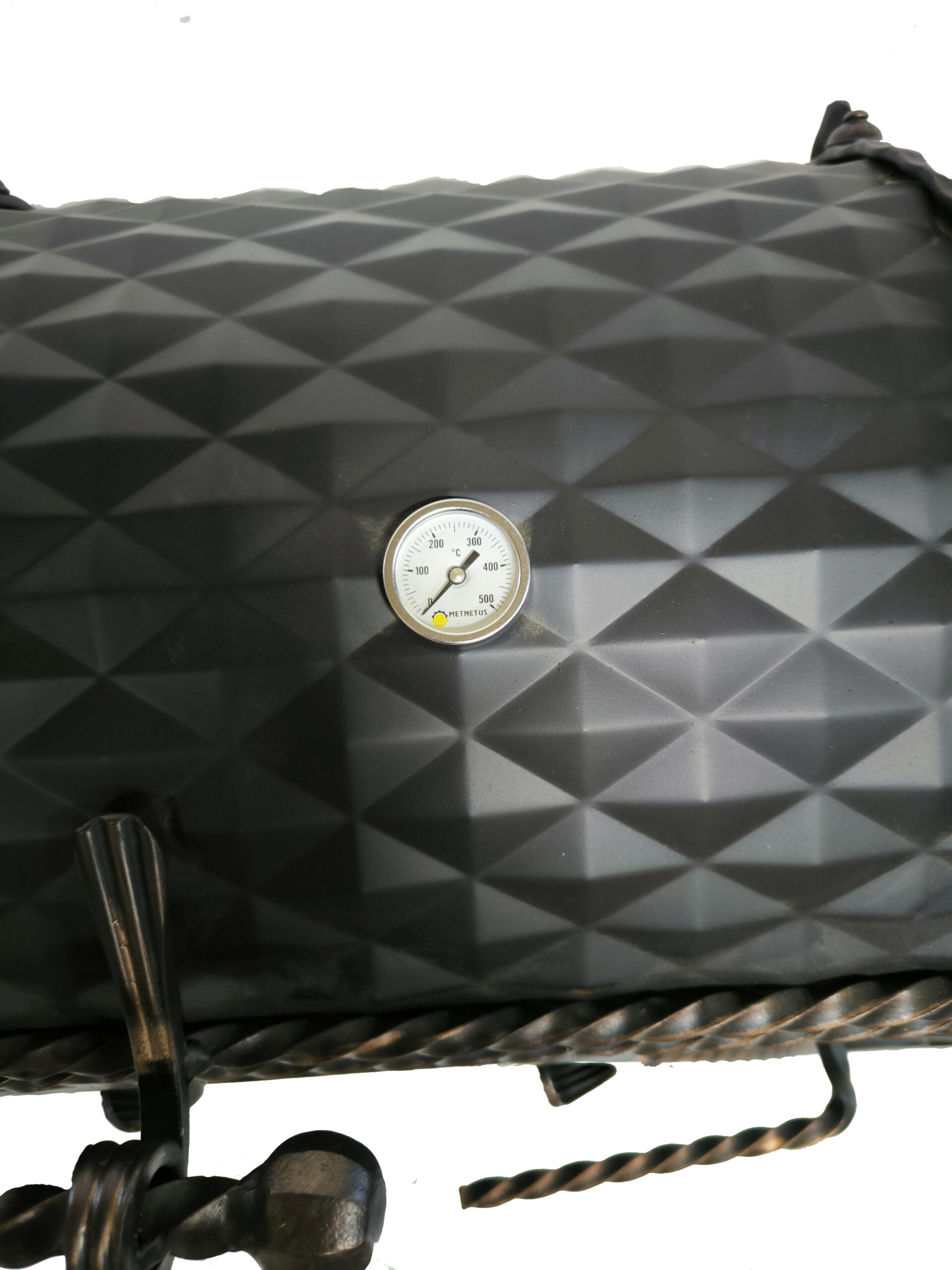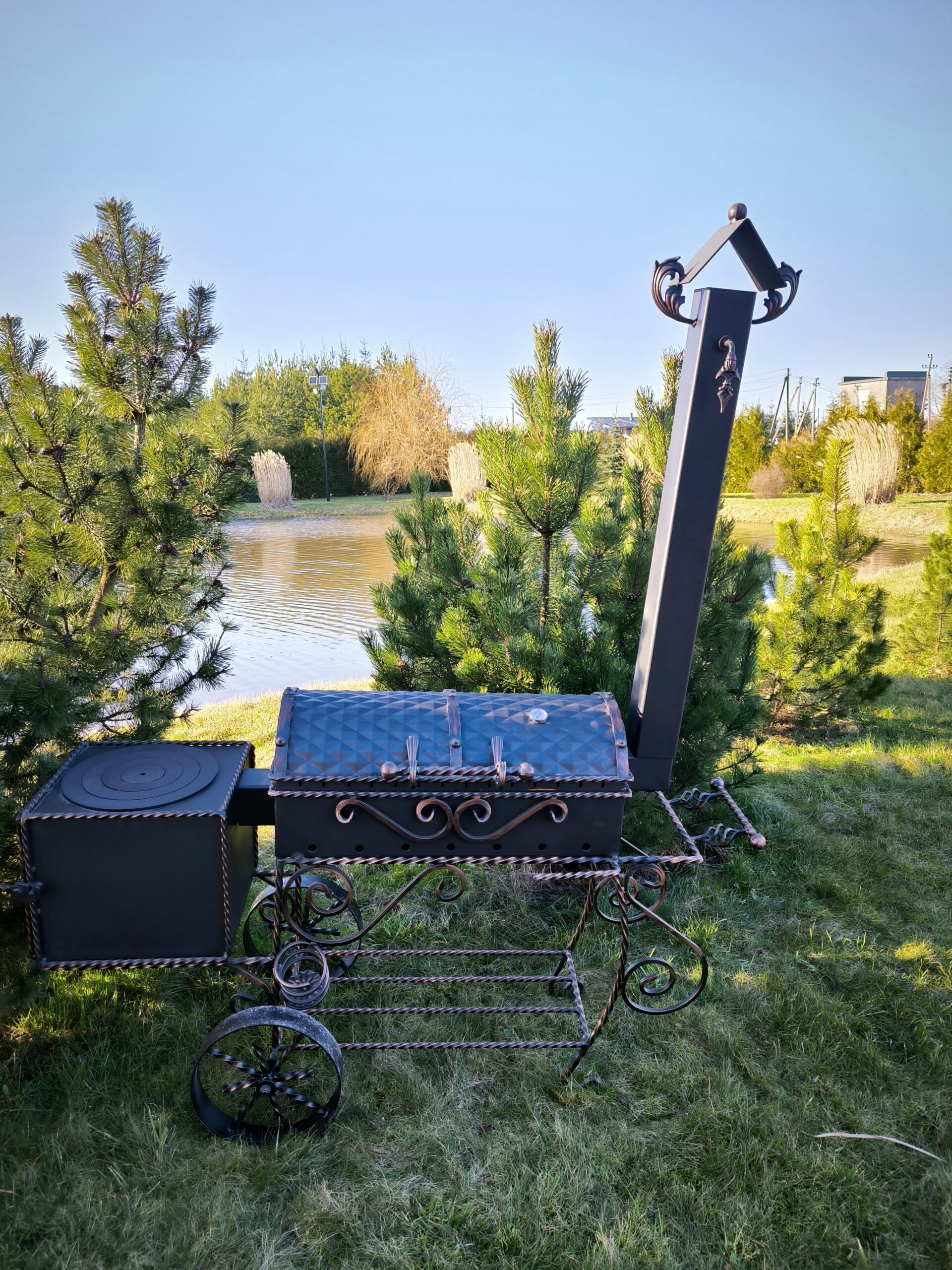 Šašlykinė su dangčiu, kaminu, turi rankenėlę ant kurios galima pakabinti žarsteklį.